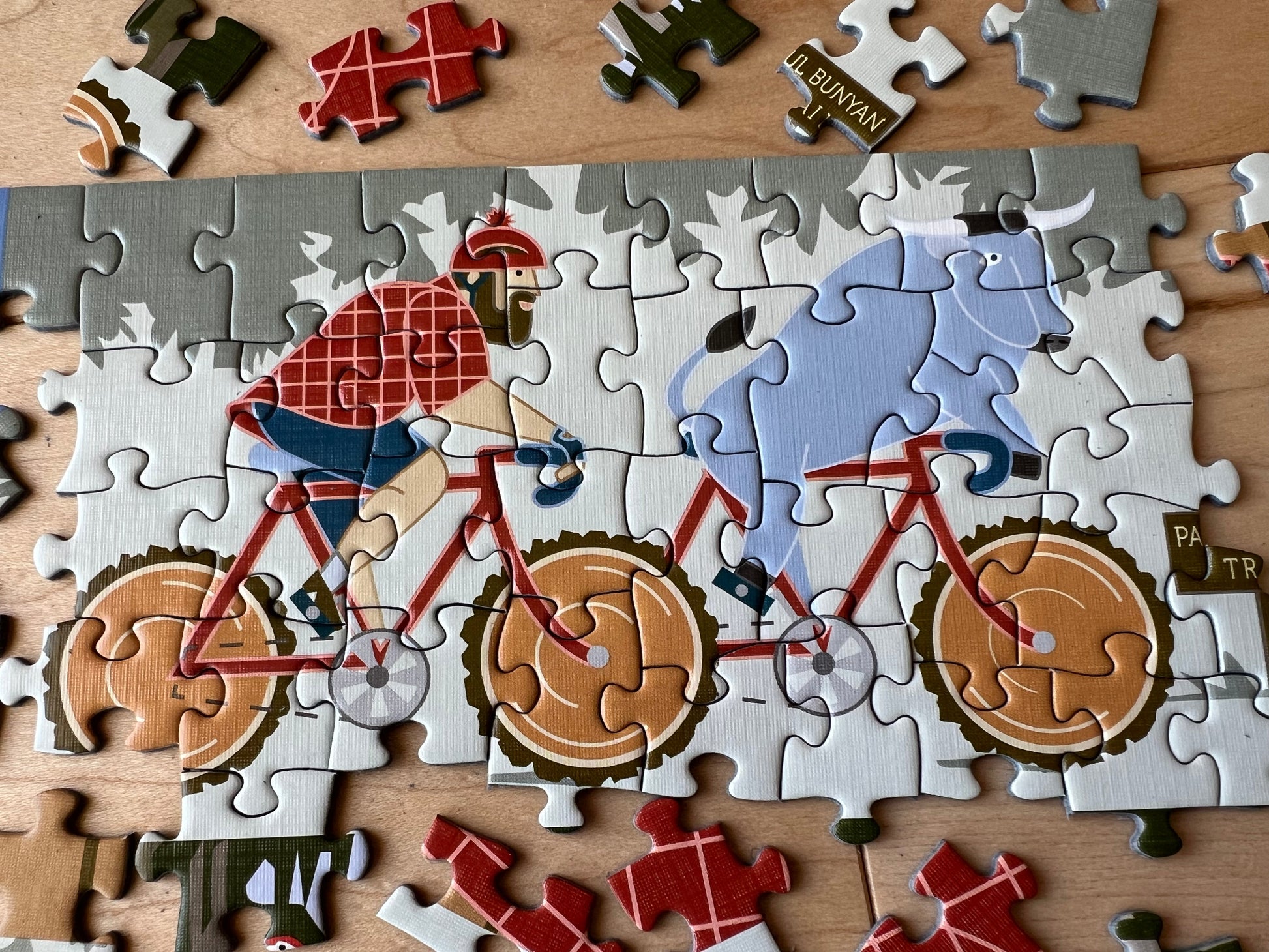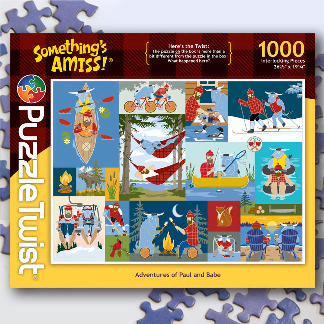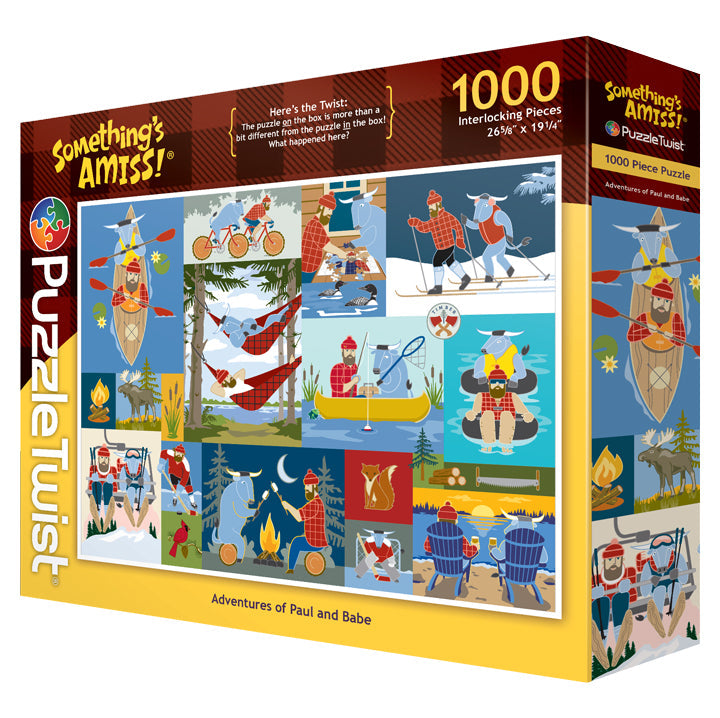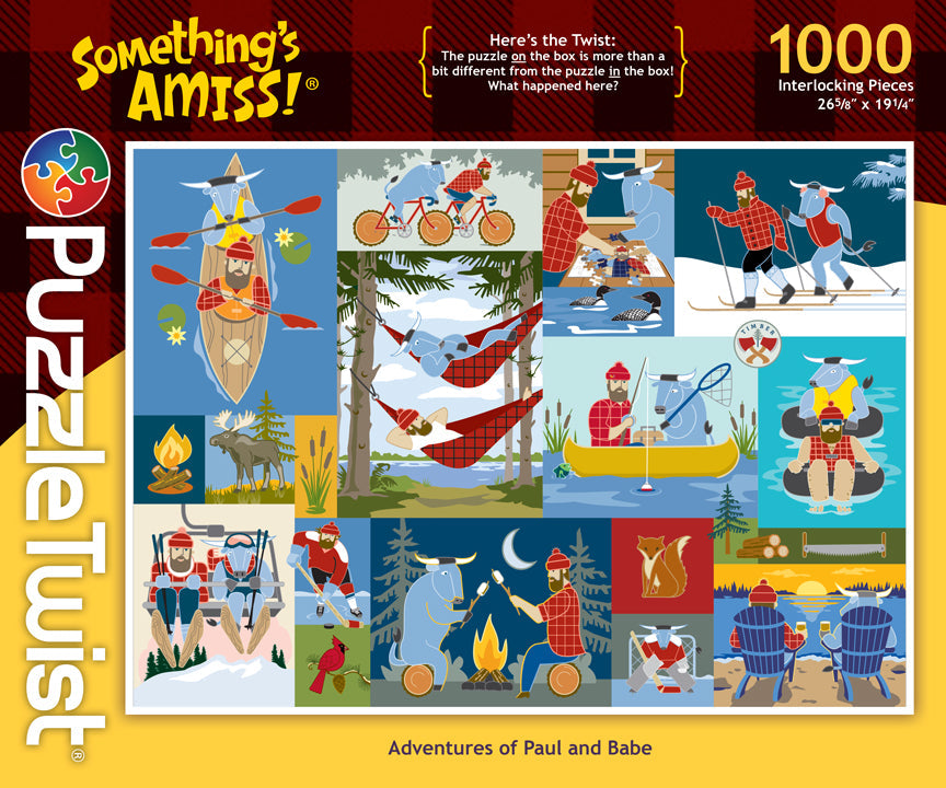 With home studio in Minneapolis, Cindy Lindgren helps us imagine what these legendary companions might be up to when not cutting down trees. She calls her style Craftsman Nouveau as it has roots in tradition with a clean modern look. Her charming illustrations will peak your interest as Paul and Babe embark on some new adventures. With the addition of a few twists, it's one puzzle that may have you telling a few tales of your own.