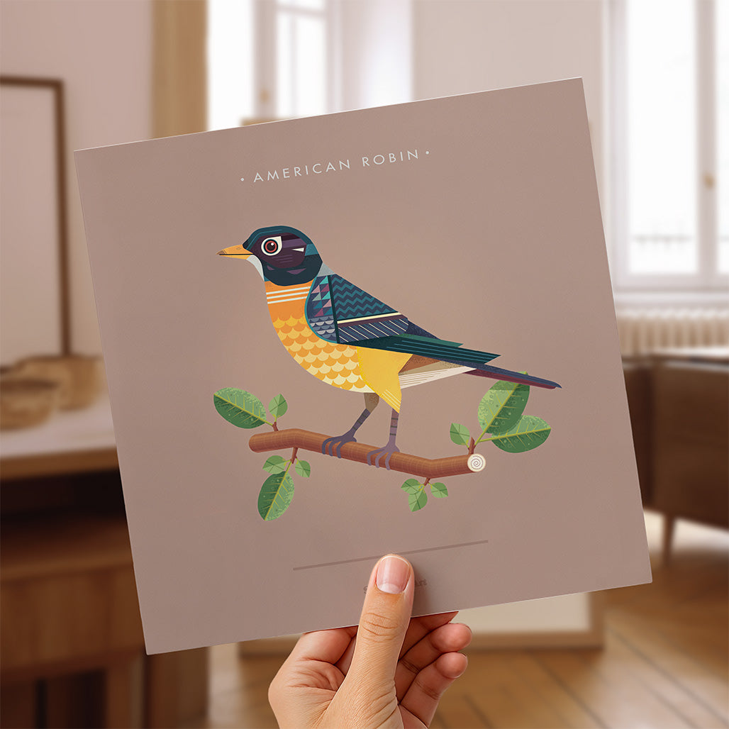 This elegant Art Deco-inspired print showcases an American Robin rendered in sleek, modern geometric shapes with a mid-century modern flair. The vibrant yet stylized design makes a striking statement while fitting seamlessly into contemporary or vintage-inspired décor.