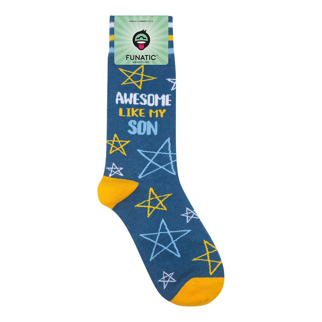 Having an awesome son comes with perks. Like socks that brag on your behalf, for instance. The Awesome Like My Son crew socks put that proud-parent energy front and center.