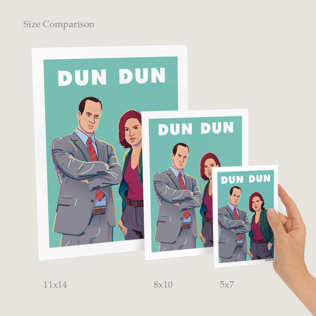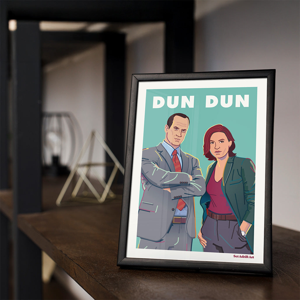 DUN DUN. This playful and colorful art print is a pop art-style tribute to TV’s most iconic crime-fighting duo—Detectives Olivia Benson and Elliot Stabler from Law & Order: SVU. Featuring bold portraits of Mariska Hargitay and Christopher Meloni, this piece is a must-have for fans of justice, drama, and sharp one-liners. Perfect for your office, living room, or true crime-themed gallery wall.