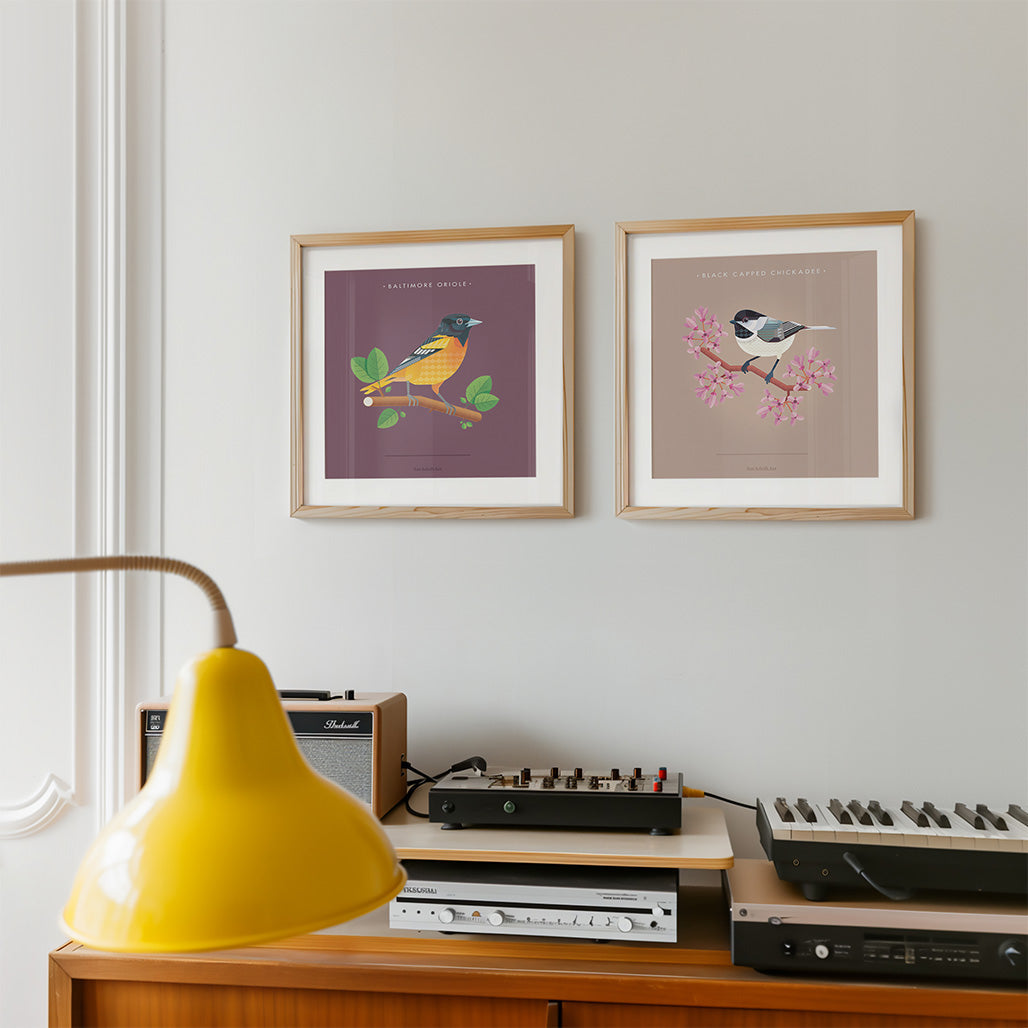 This elegant Art Deco-inspired print showcases a Black-Capped Chickadee in sleek, modern geometric shapes with a mid-century modern flair. The vibrant yet stylized design makes a striking statement while fitting seamlessly into contemporary or vintage-inspired décor.