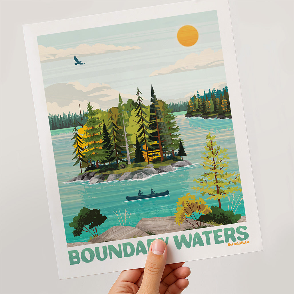 This serene and colorful art print captures the untouched beauty of Minnesota’s Boundary Waters Canoe Area Wilderness—a place of quiet lakes, towering pines, and starlit skies. Whether you’ve paddled through its waters or simply dream of the Northwoods, this piece brings the peace and wonder of the BWCA into your home.