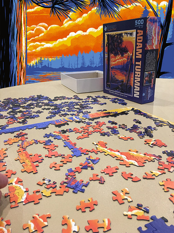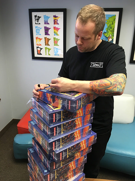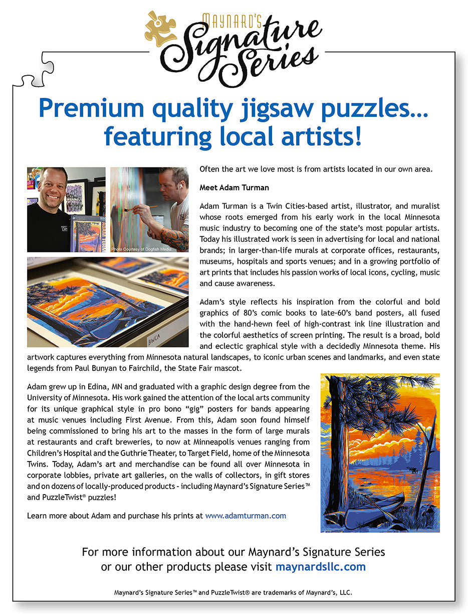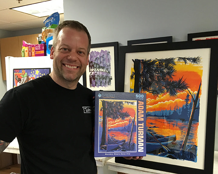 Adam Turman is well known for his bold, colorful and eye-catching illustrations of Minnesota landmarks. The Boundary Waters Canoe Area (BWCA), is a 1,090,000 acre wilderness area within the Superior National Forest in northeastern Minnesota. This puzzle depicts the beautiful landscapes, recreation and wildlife that makes up a small sliver of the BWCA.