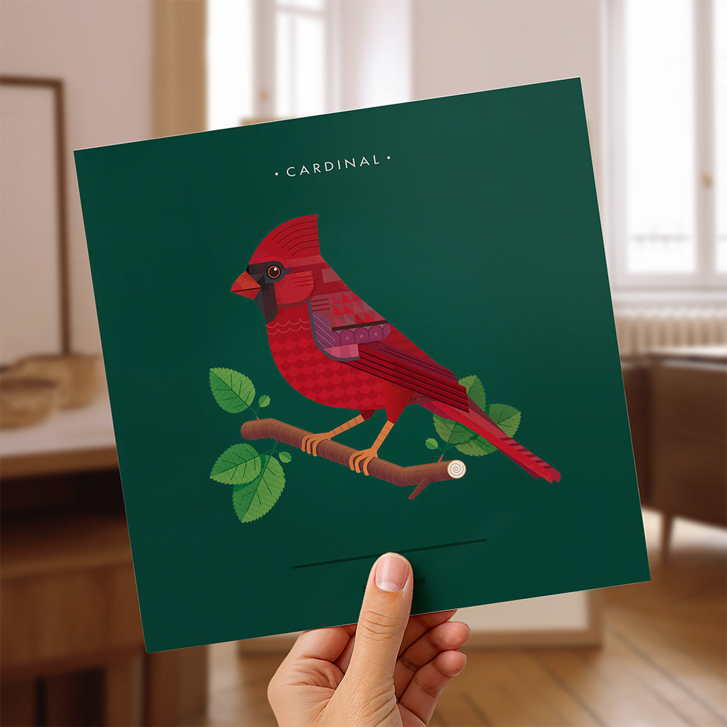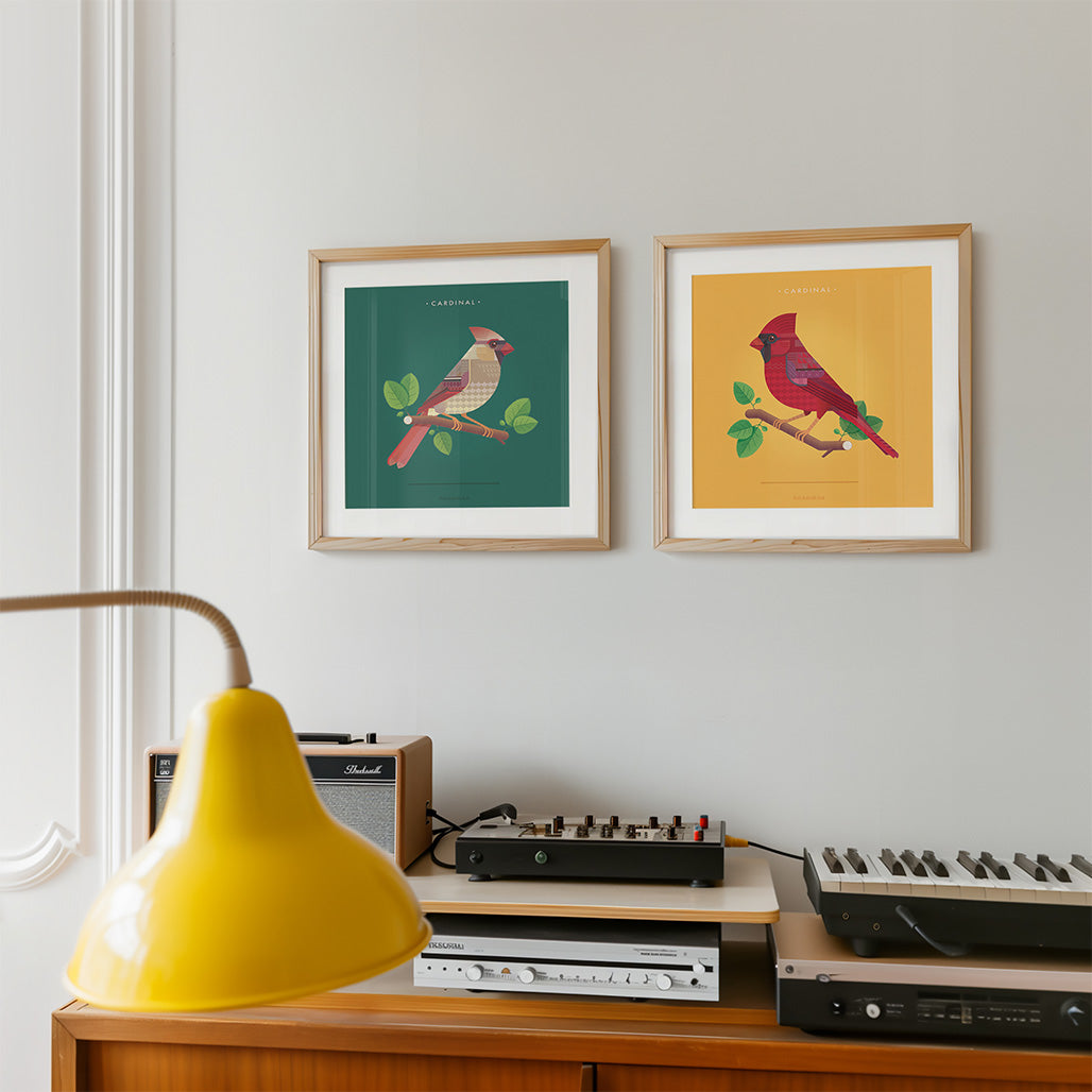 This elegant Art Deco-inspired print showcases a Male Cardinal rendered in sleek, modern geometric shapes with a mid-century modern flair. The vibrant yet stylized design makes a striking statement while fitting seamlessly into contemporary or vintage-inspired décor.