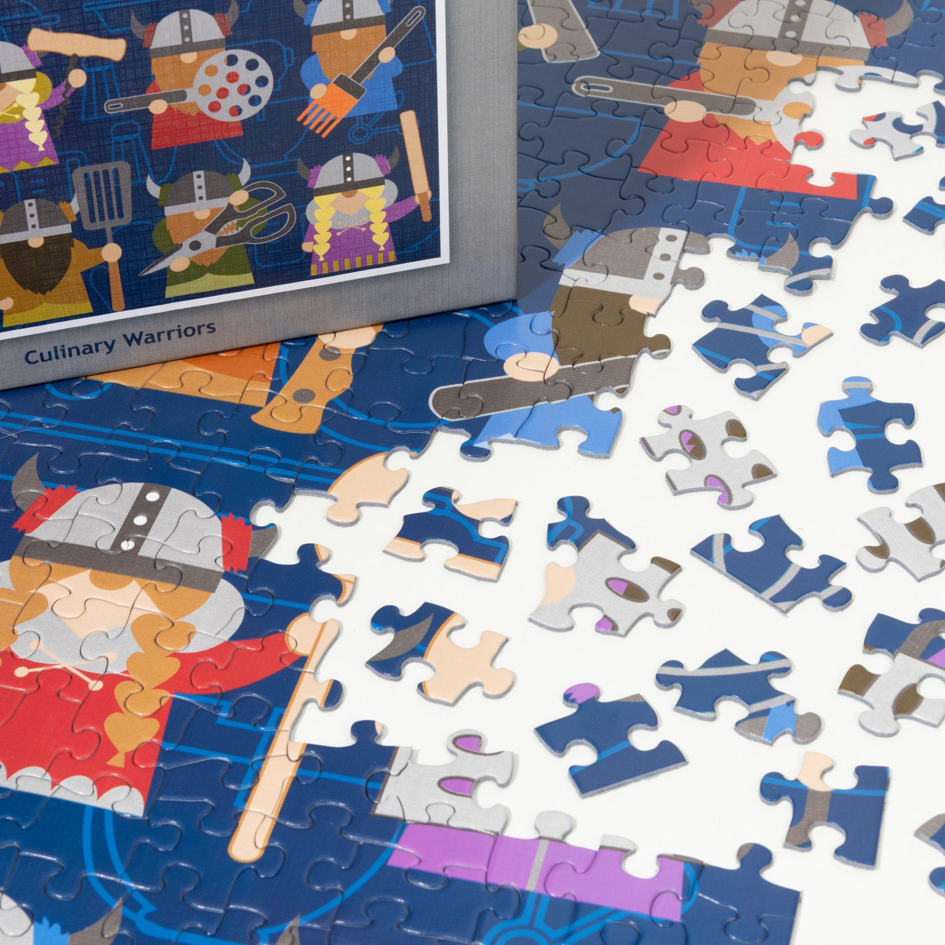 Minneapolis artist Cindy Lindgren captures her love of Scandinavian themes in her distinct Craftsman Nouveau style. Inspired by nature, local landmarks, and a clean, modern aesthetic, her work blends traditional roots with a fresh look, like in this Culinary Warriors puzzle, where bold lines and colors bring Viking Chefs to life.