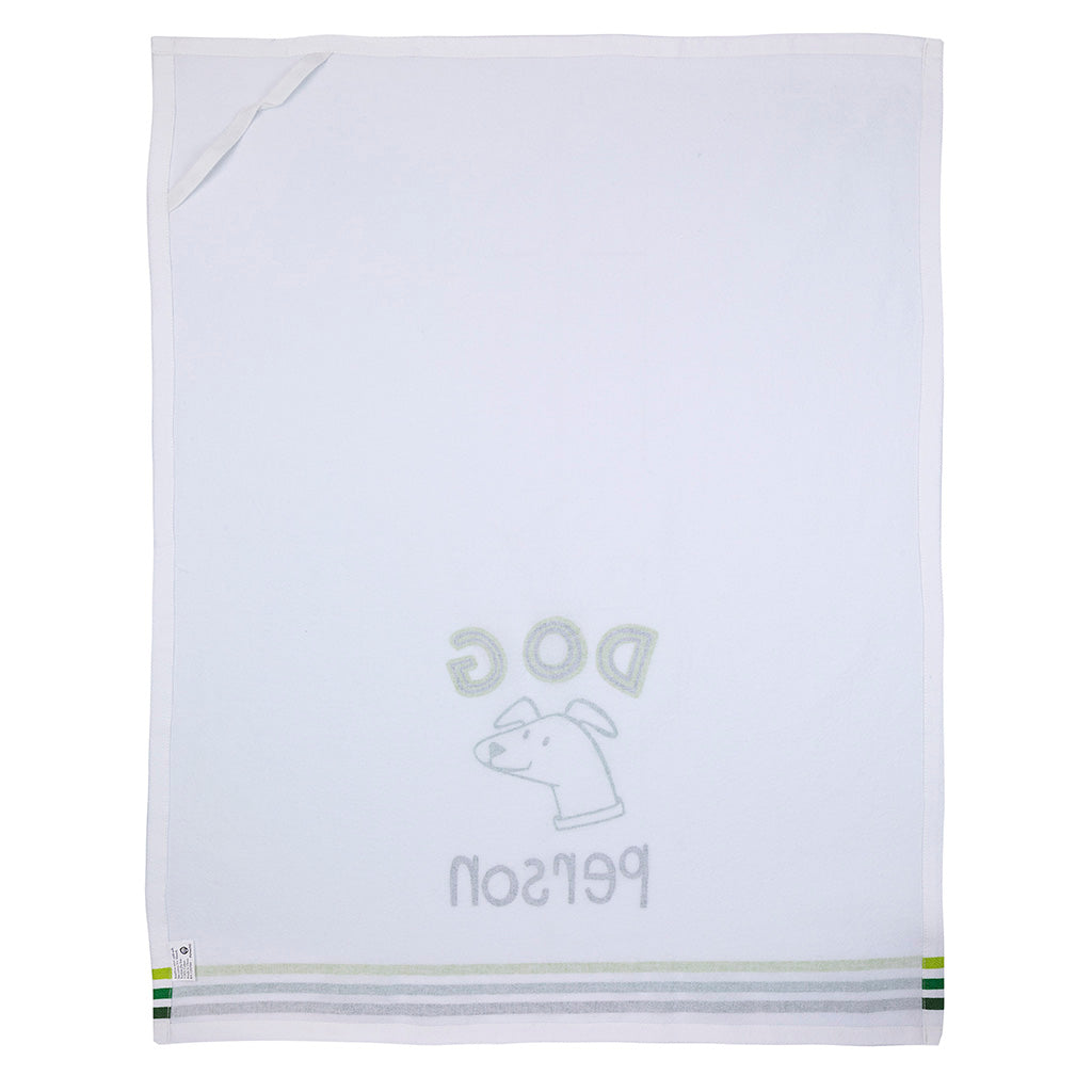Printed on crisp white cotton, it features a joyful green illustration of a dog paired with stylish dark and light green stripes and the simple truth printed right there: Dog Person. Whether it’s mopping up muddy paw prints, drying dishes, or just hanging on display as your kitchen’s unofficial mascot, it’s useful and adorable.