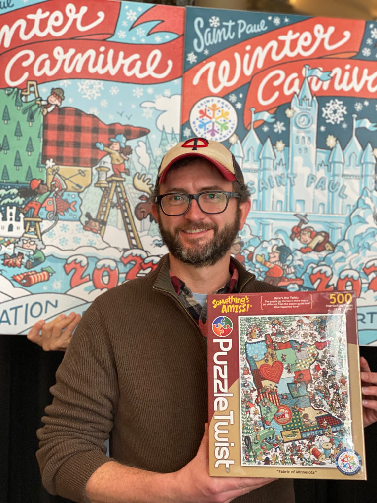 Minnesota native, Kevin Cannon is a cartoonist and illustrator known for his detailed cartoon maps and humorous all-age graphic novels. Kevin channeled his love fro Minnesota winters as he illustrated Fabric of Minnesota for the 2022 Saint Paul Winter Carnival Jigsaw Puzzle Contest. Kevin was also the artist for the 2022 Winter Carnival buttons. With a number of twists, this is one puzzle that is guaranteed to leave you in stitches!