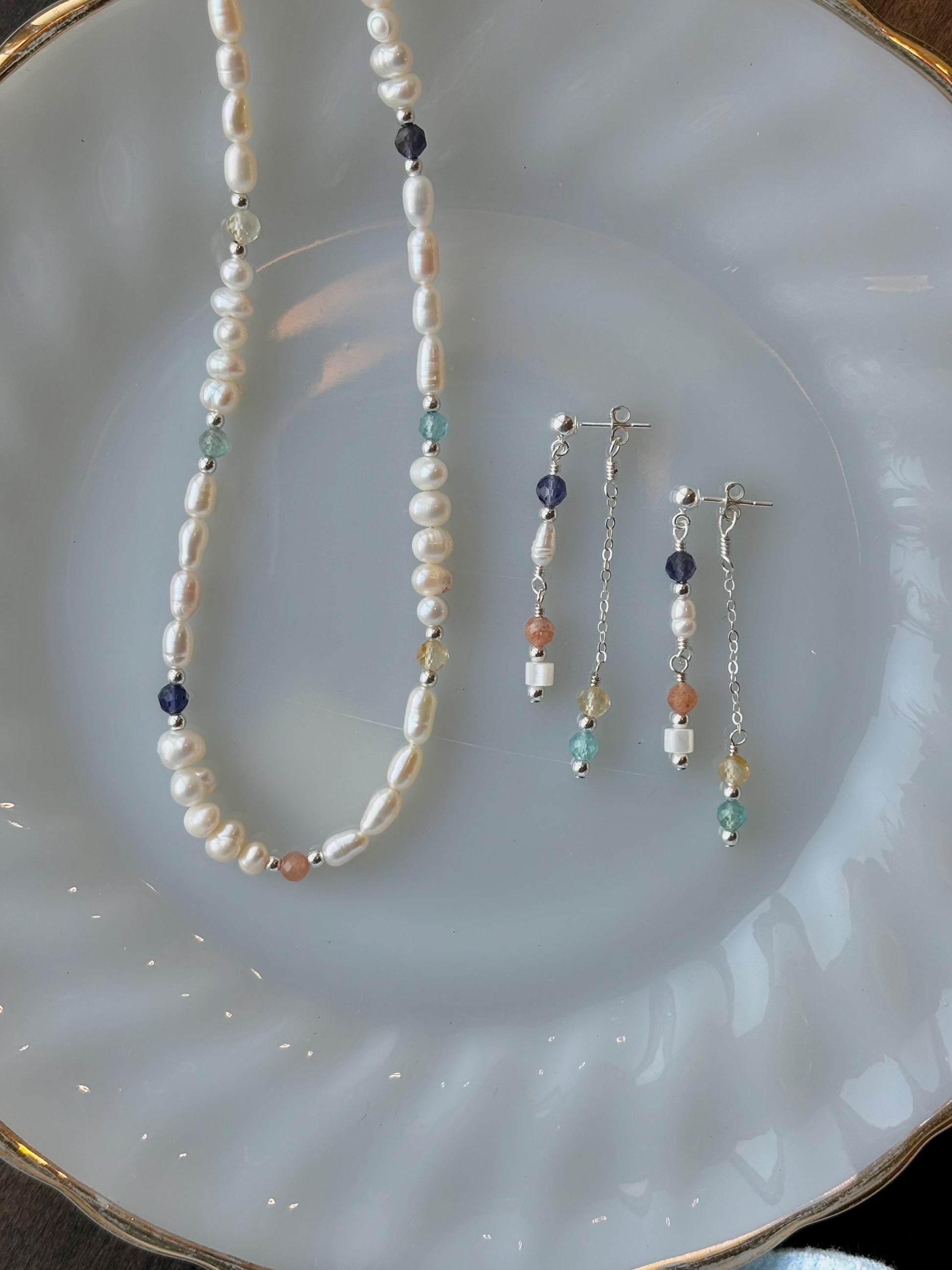 - Pastel: iolite, sunstone, citrine, apatite, freshwater pearls