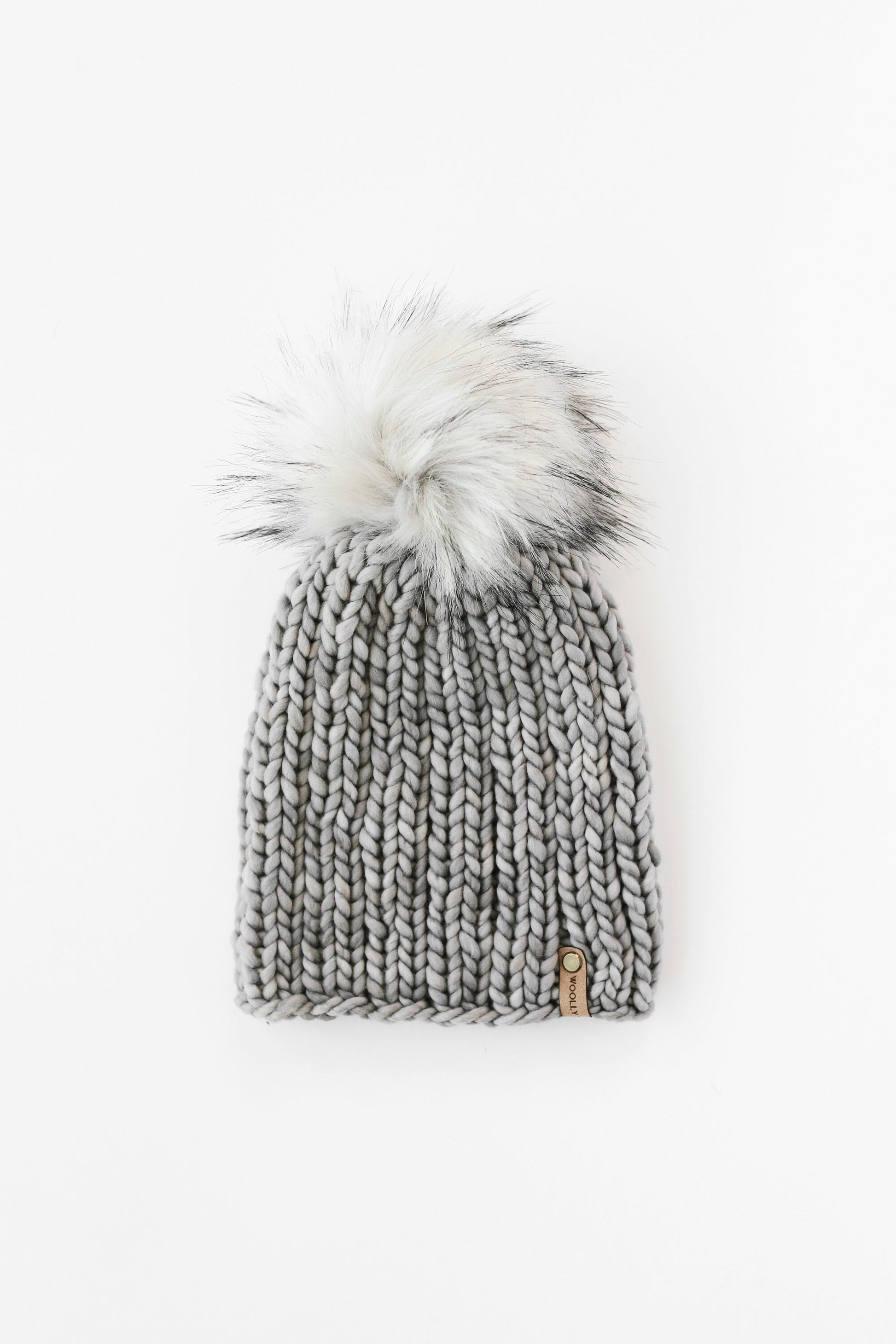 Gray Merino Wool Ribbed Knit Hat with Faux Fur Pom Pom