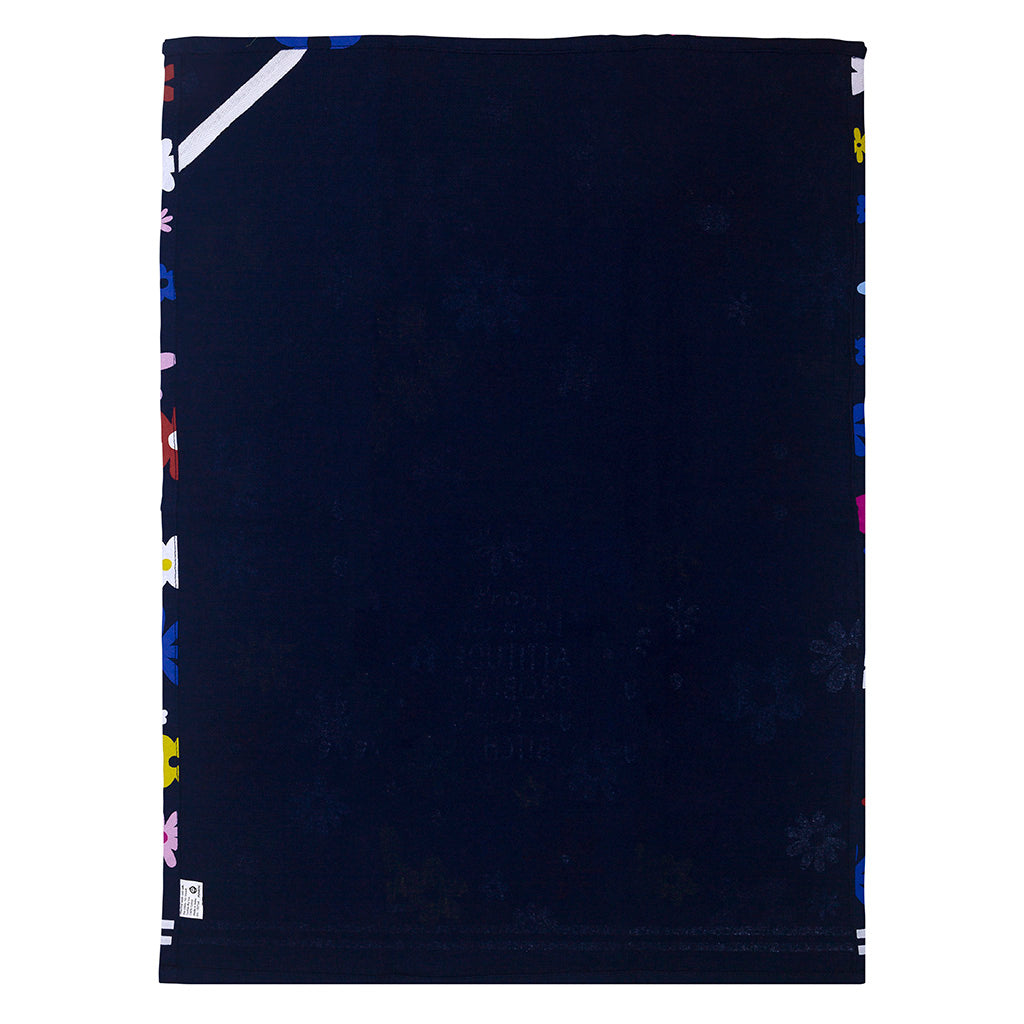 Saturated in deep blue with brash white lettering, it’s surrounded by a riot of red, pink, yellow, and blue blooms that are charming and a little chaotic. Made from 100% soft, absorbent cotton, it measures a full 19" x 25" and includes a hang loop so you can keep it ready. Attitude this bold deserves easy access.