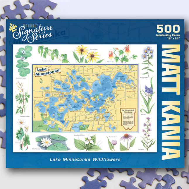 Minnesota artist Matt Kania is an active plein air oil painter and printmaker who has been designing and illustrating maps for years. Within this puzzle Matt will have you touring every bay of Lake Minnetonka with close up views of the wildflowers often seen along the shoreline – from the black-eyed Susan to the White Water Lily – a boat trip you’re sure to enjoy.