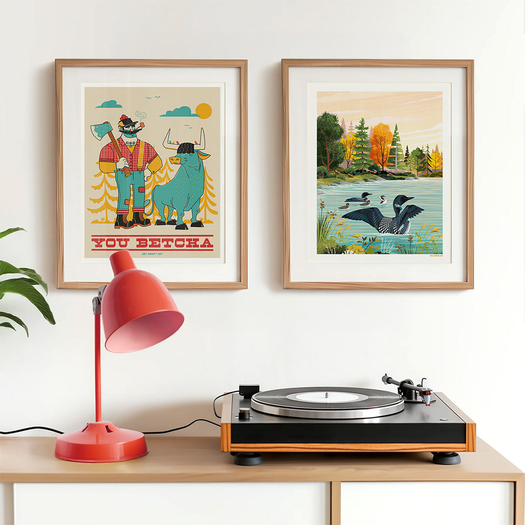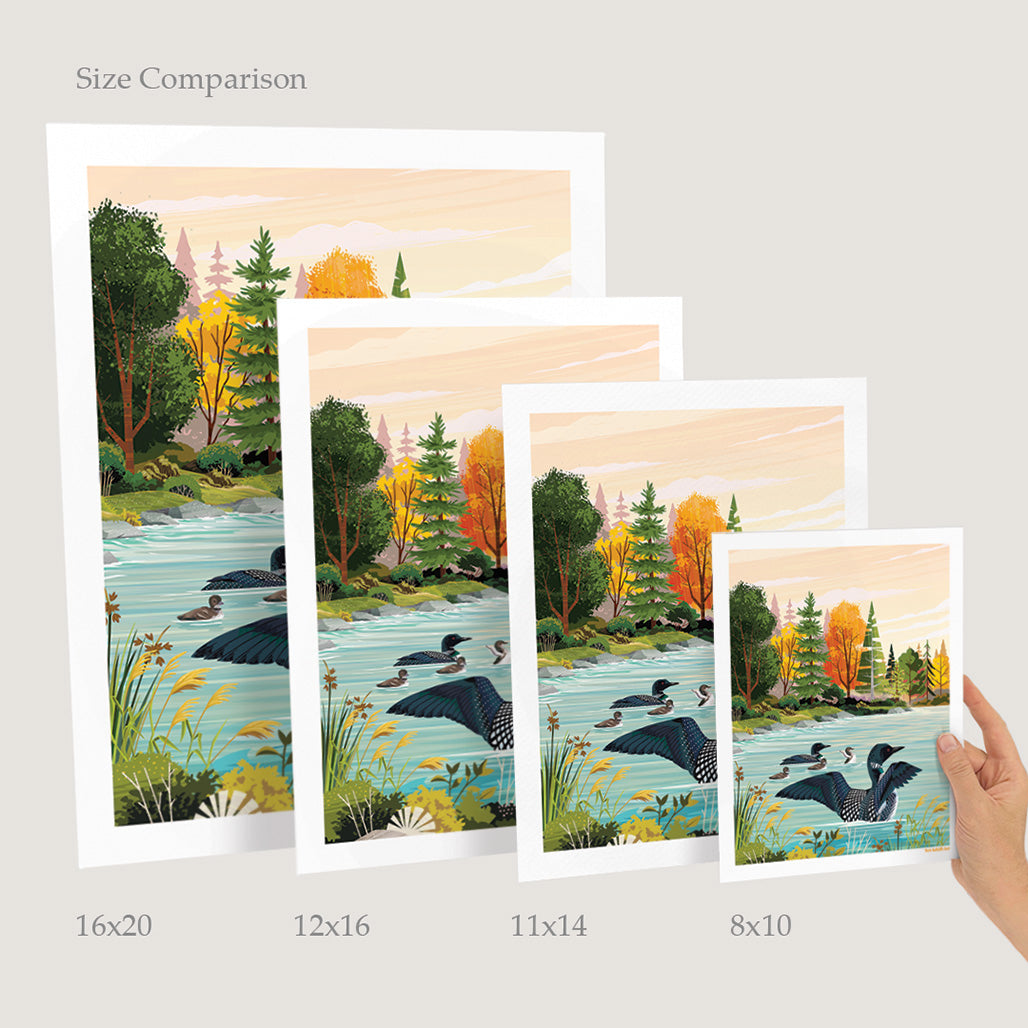 Bright colorful stylized nature art print. Northern Woods with a family of Loons on the lake on sunny summer morning.