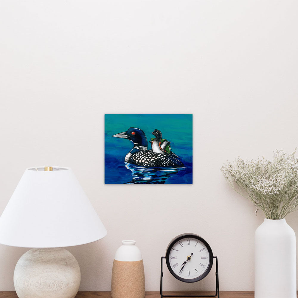 Do you ever think of a baby loon on it's mother's back as a backpack? On this beautiful Minnesota day, Mama Loon and her little chick, perched snugly on her back, like a living backpack, set out for a day of aquatic adventures. The chick, sporting an adorably tiny Duluth pack, bounces excitedly on Mama's back, causing little ripples in the sparkling blue water. "Hold on tight, Little Dipper!"