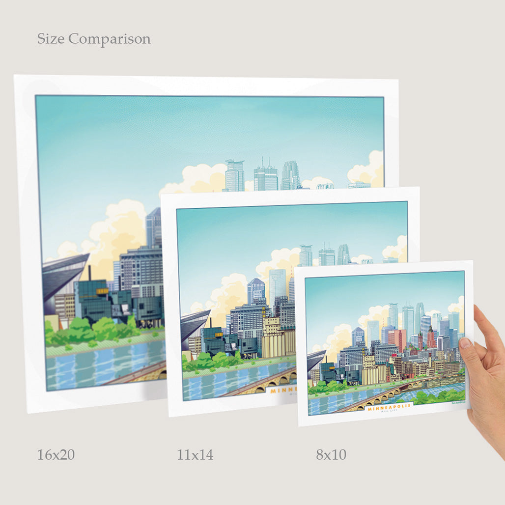 Highly detailed image of the Minneapolis City Skyline overlooking the Mississippi River and Stone Arch Bridge. Bright colorful illustration of Downtown Minneapolis, including the Gold Medal Floor Building, Mill District, Guthrie Theater, US Bank Stadium, Town Hall and city Skyscrapers.