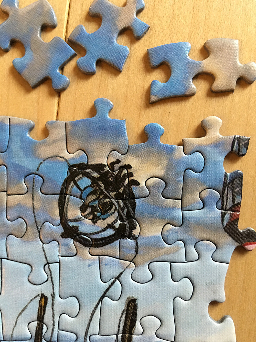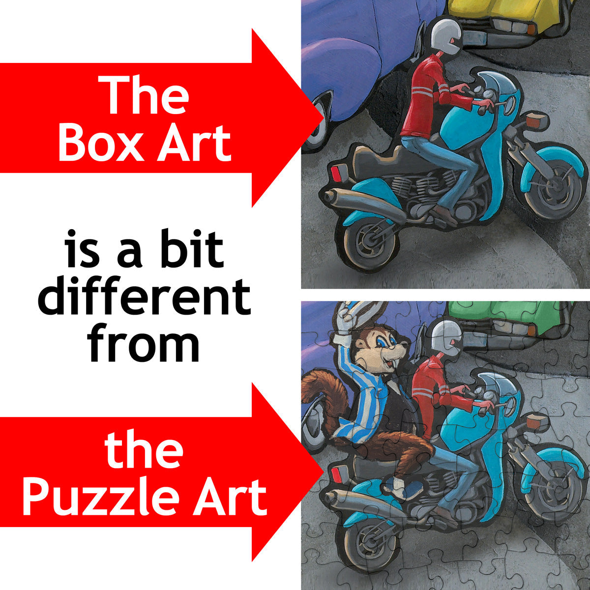 While assembling this puzzle you will discover a number of changes from the box cover art to the actual puzzle art you assemble – intended to make the overall jigsaw puzzle experience more engaging and fun. You may discover a few surprises that will leave you with that "ah-ha" sensation and/or a few tricky changes that will feel like little victories when you solve them. Our puzzles tend to be a little more challenging than the traditional jigsaw puzzle you're familiar with... but we're not trying to make them impossible... just more fun!