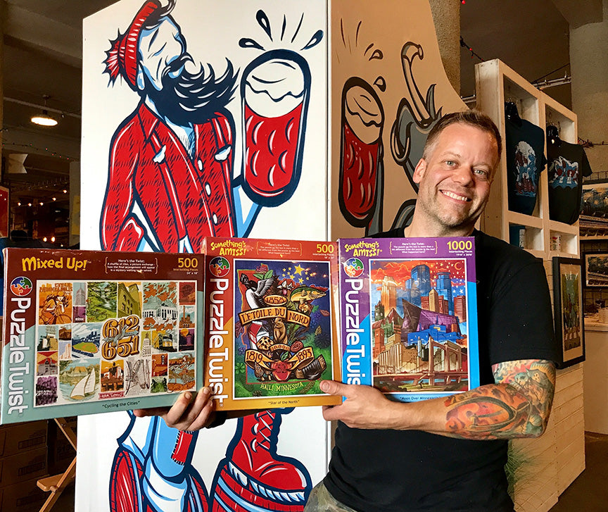 Adam Turman is well known for his bold, colorful and eye-catching screen prints and murals of iconic landmarks throughout the Twin Cities. This jigsaw displays the Minneapolis skyline with the addition of the US Bank Stadium.
