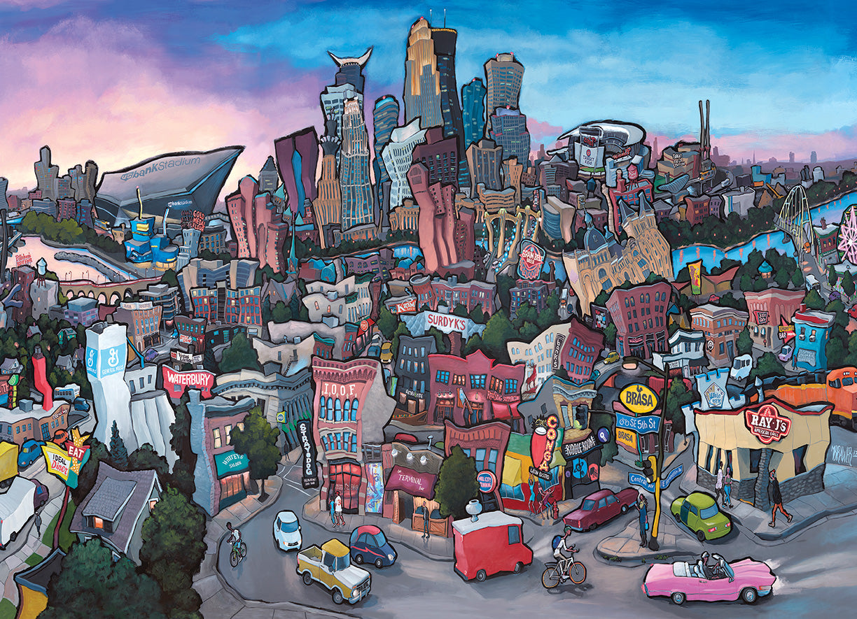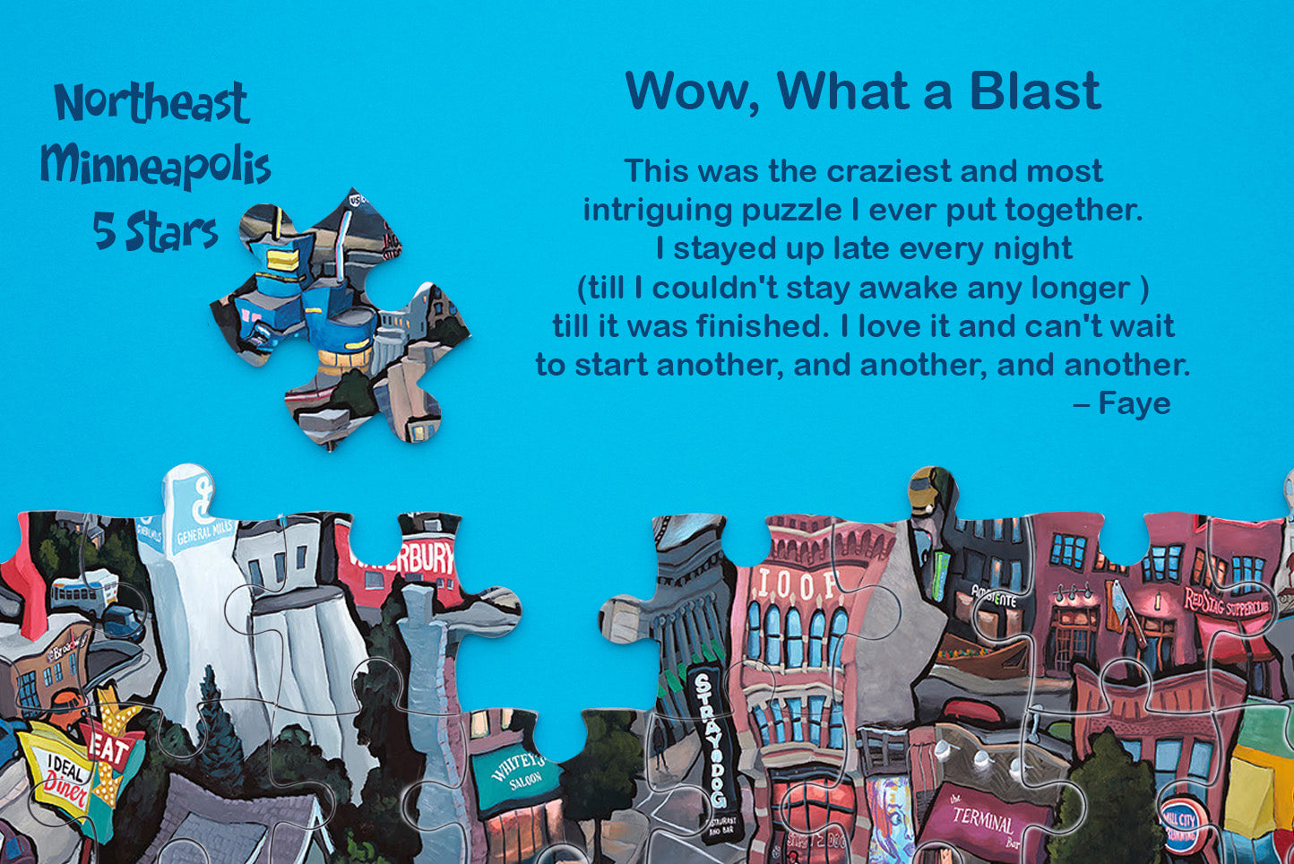 Twin Cities native and nationally-acclaimed artist, Michael Birawer, is best known for his animated paintings of cityscapes throughout North America. Northeast Minneapolis, his latest creation, brings downtown Minneapolis and the Northeast Arts District full of artisanal restaurants, craft breweries, delis and dive bars to life. With his gallery located within walking distance of the Ideal Diner, Michael has a personal connection to the community in Northeast Minneapolis - and you will find it reflected within this puzzle. Enjoy touring Northeast Minneapolis while you puzzle this puzzle!