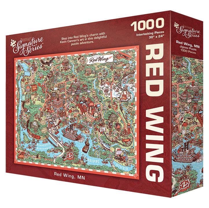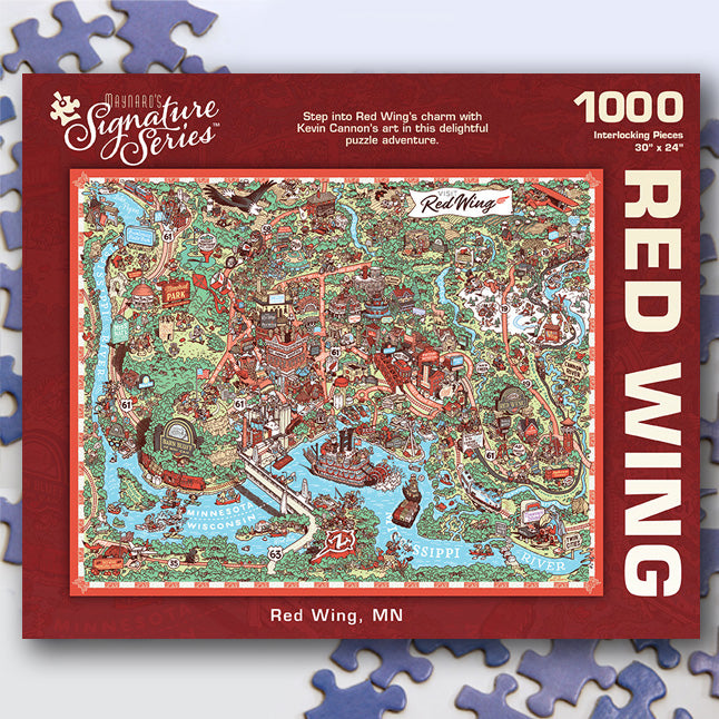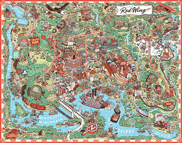 Artist Kevin Cannon (pictured here with Finnigan), inspired by childhood trips to Red Wing, now enjoys climbing Barn Bluff and strolling the historic streets of Red Wing with his family. Cannon has been the commemorative artist for the Minnesota State Fair and the Saint Paul Winter Carnival. He is thrilled to bring his vibrant style to this cartoon map. Like Red Wing, the puzzle is rich with discoveries, promising endless fun around every corner!