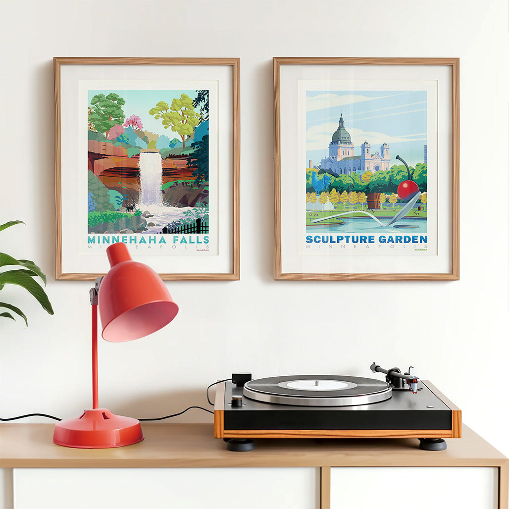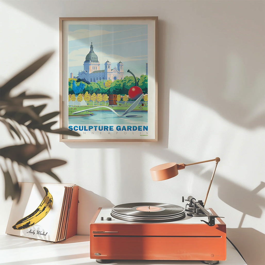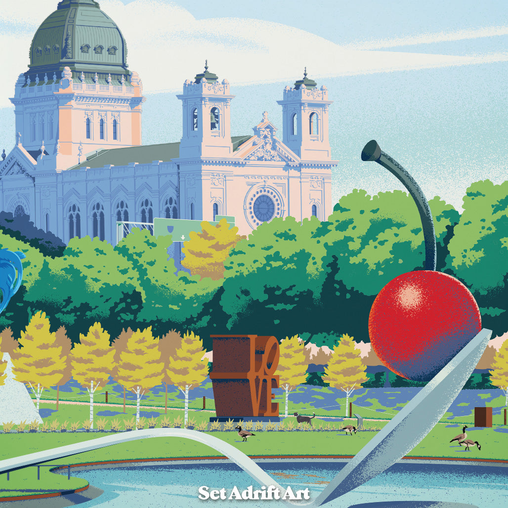 A vibrant tribute to one of Minneapolis's most beloved landmarks—the Sculpture Garden. This colorful art print features the iconic Spoonbridge and Cherry, with the striking Hahn/Cock (rooster sculpture) and the historic Basilica of Saint Mary in the background.