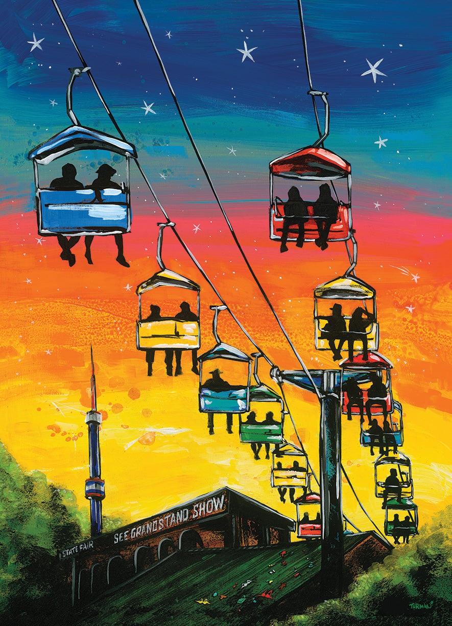 Adam Turman, known for his bold, colorful, and eye-catching illustrations of Minnesota landmarks, invites you on a highflying adventure above the State Fair in Sky Glidin’. Experience the fair from a new perspective as you float by Adam’s gallery located in the Grandstand. This puzzle captures the essence of the great get-together, from people-watching to enjoying live music and food on a stick, with added twists to lift your spirits. Enjoy the ride!