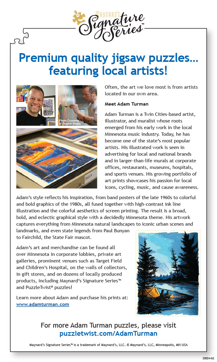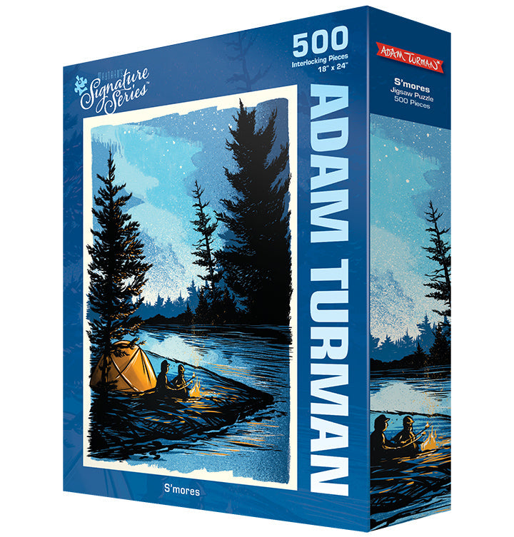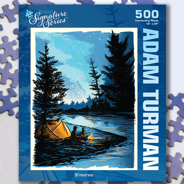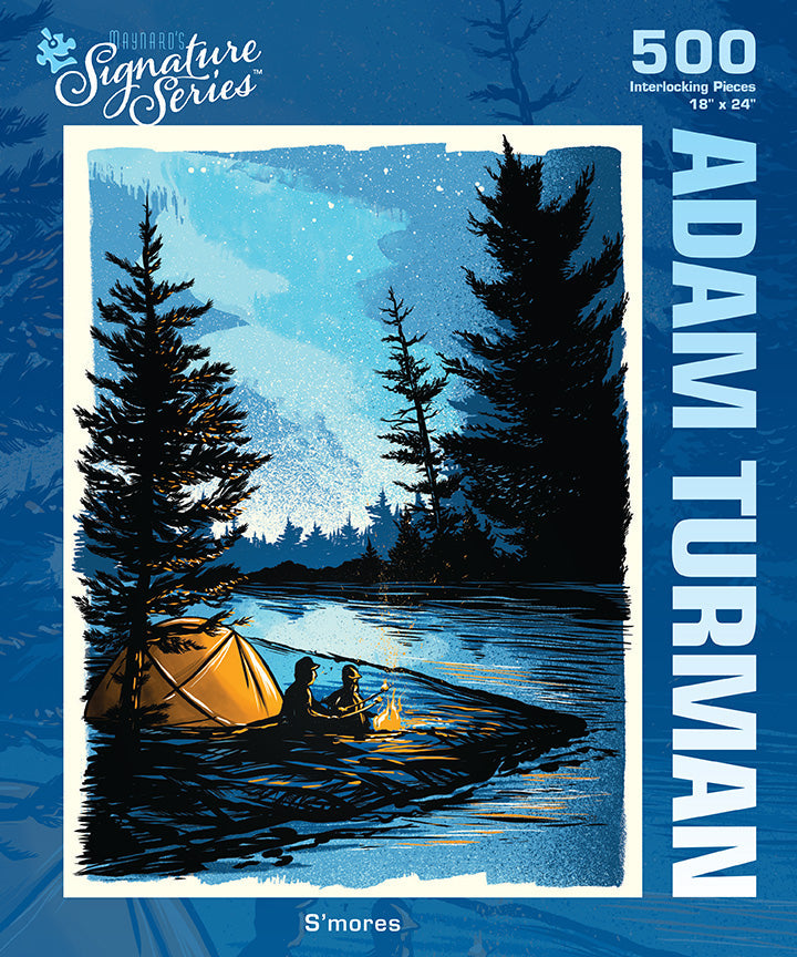 Adam Turman, a Twin Cities-based artist, illustrator, and muralist, is well known for his vibrant, eye-catching imagery. S'mores captures a favorite camping tradition of roasting marshmallows by the campfire. This puzzle ignites outdoor adventure, inviting you back fro 'some more' fun with each piece you connect.