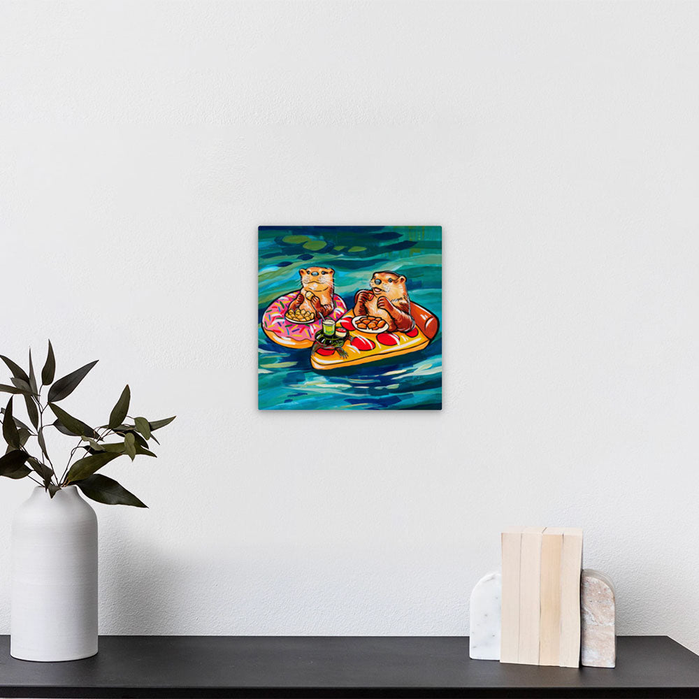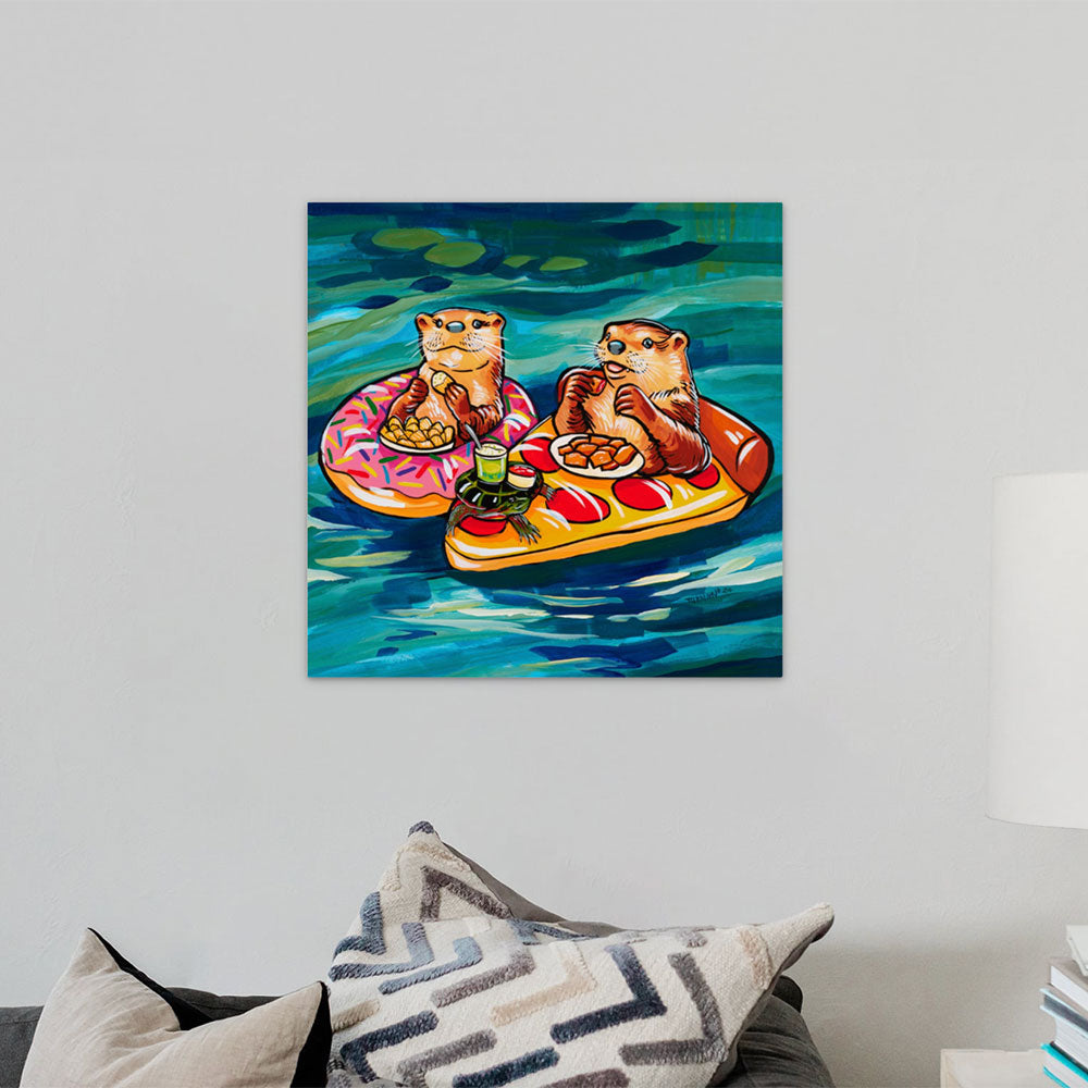 Ha, I think this painting is funny. The prompt of this painting is snacks. When I think of snacks, Top the Tater, Rip-L chips, Pizza Rolls and marinara dip come to mind. Mmmm. But then, the dips need to be placed on something, so why not a Painted Turtle? And then, I think who would be eating those snacks in a cute way on their tummies? River Otters floating down a river in donut and pizza slice-shaped floaties of course.