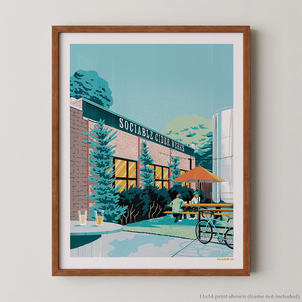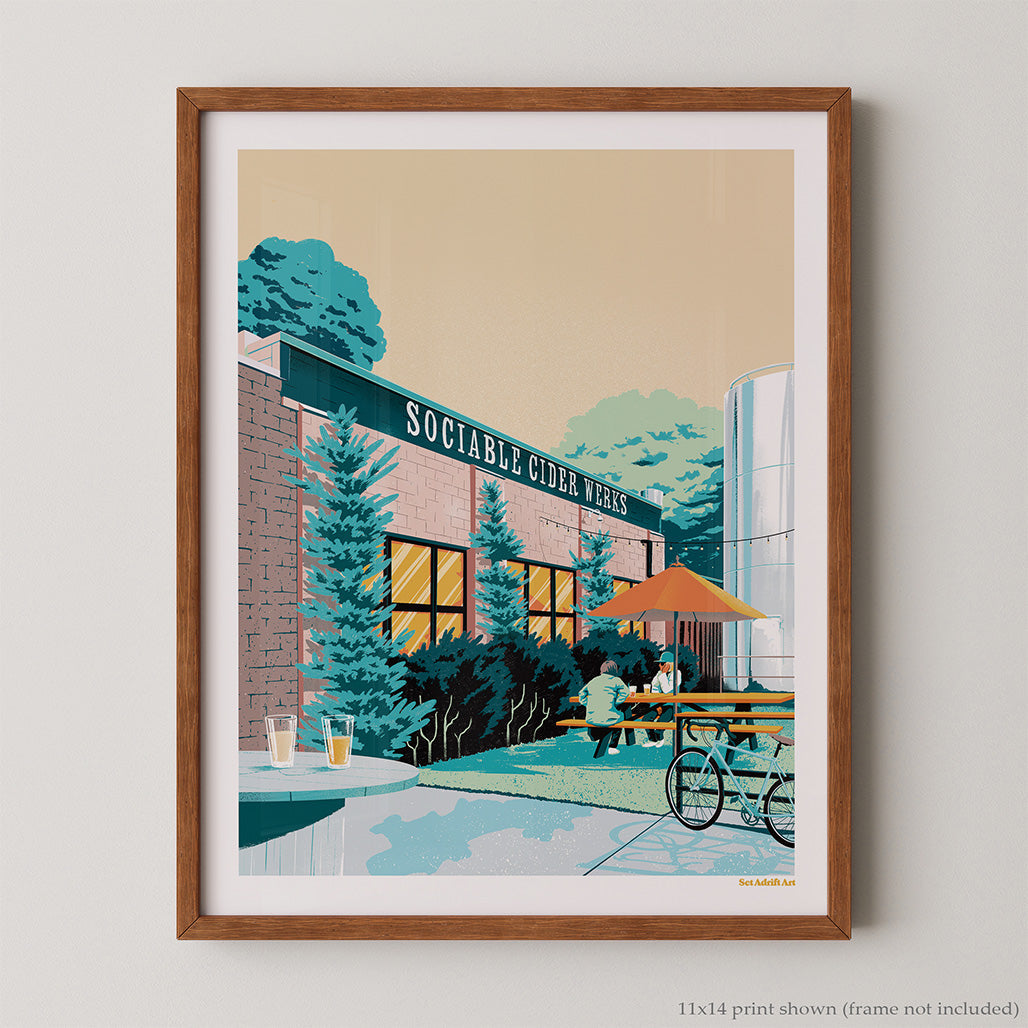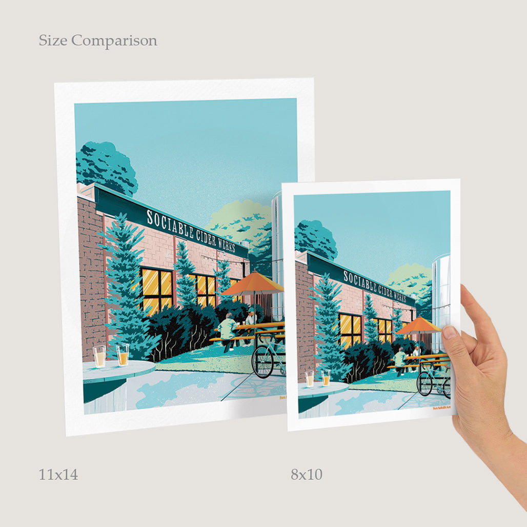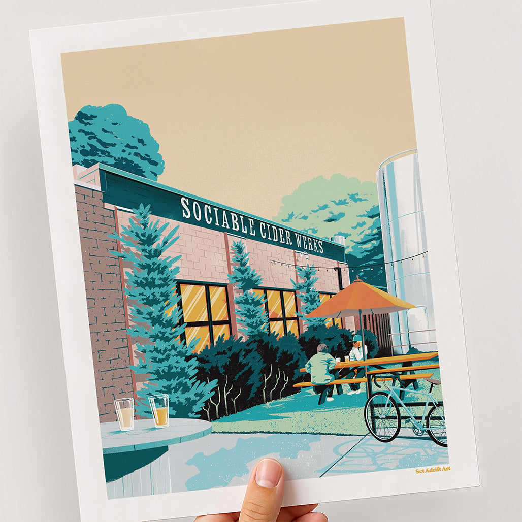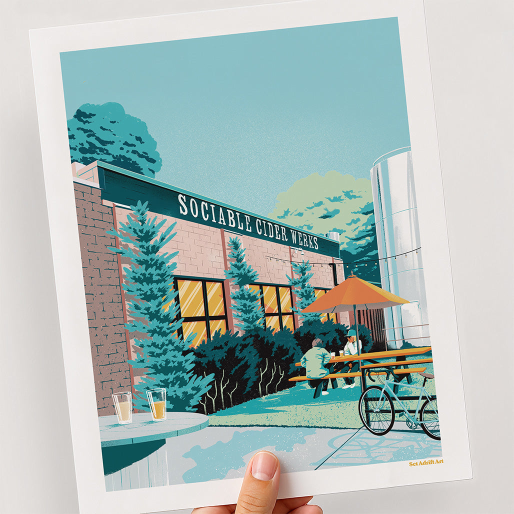 Raise a glass to all seasons at Sociable Cider Werks! This colorful and detailed art print celebrates one of Northeast Minneapolis’ favorite hangouts — a summer haven for cyclists and a winter home for curlers. Featuring the iconic taproom and patio scene, it captures the energy, community, and good vibes that make Sociable a local legend. A perfect gift for cider lovers, Minneapolis fans, or anyone who knows how to make the most of the season.