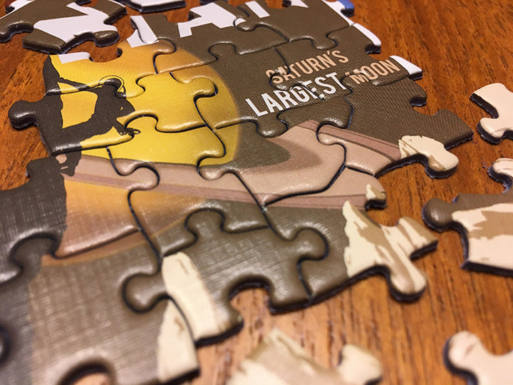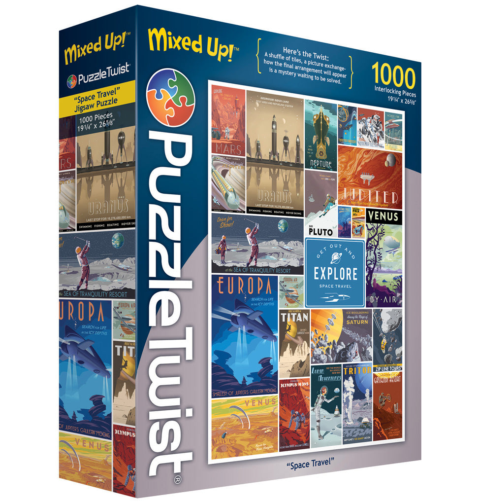 Steve Thomas has taken his retro-futuristic approach to art and created a series of space travel posters. These images will have you dreaming about exploring the solar-system – from climbing Olympus Mons on Mars to skiing Pluto!!! Thanks Steve for creating a jigsaw puzzle that is truly out of this world!