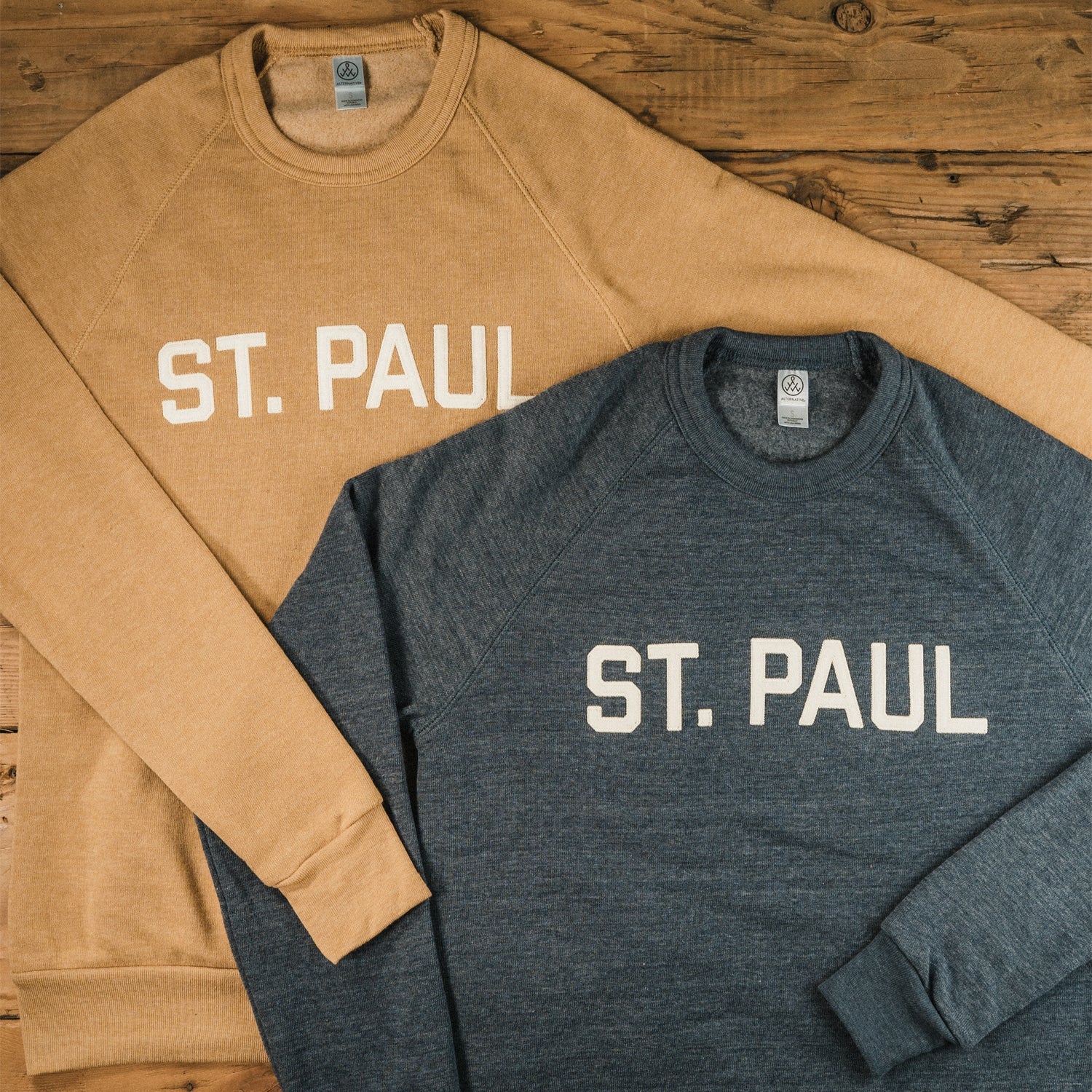 A new color for our popular St. Paul crew neck sweatshirt. Eggshell felt lettering on a heather camel sweatshirt. Stay cozy and look great doing it!