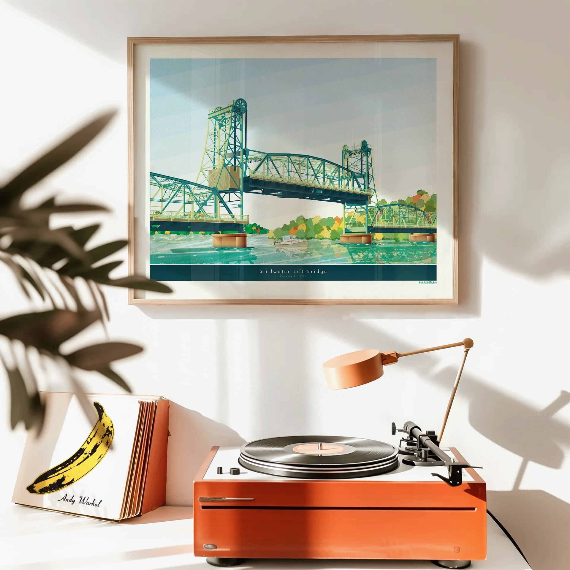 The iconic Stillwater lift bridge was built in 1931 crossing the St. Croix River between Stillwater, Minnesota, and Hudson, Wisconsin.