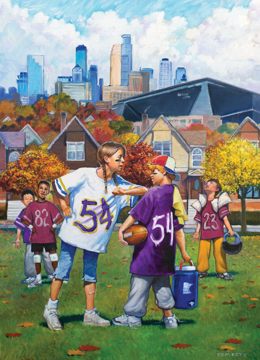 Tom Foty is known for his painting style that uniquely captures the emotion of a scene with lighting, color and composition. We hope you enjoy reminiscing those good old days passing a pig skin around in the park!