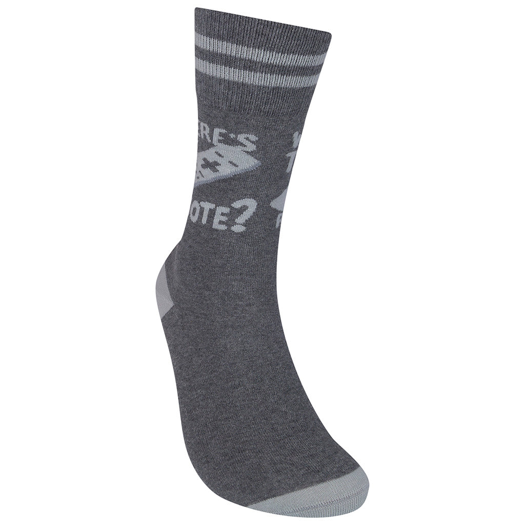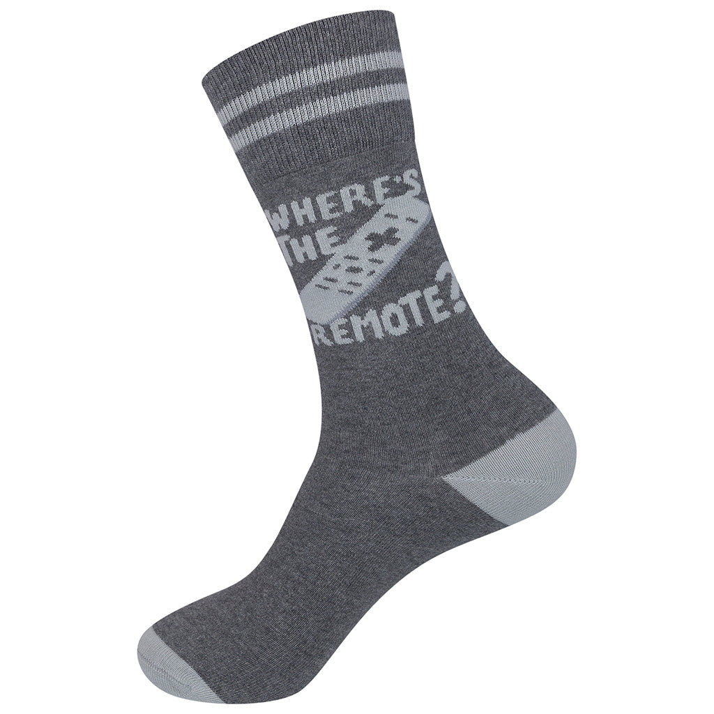 Some mysteries will never be solved, like how the remote always disappears between the cushions. These gray socks lean into the struggle with light gray toes, heels, and cuff stripes, plus an image of a TV remote surrounded by the eternal question: “Where’s The Remote?”