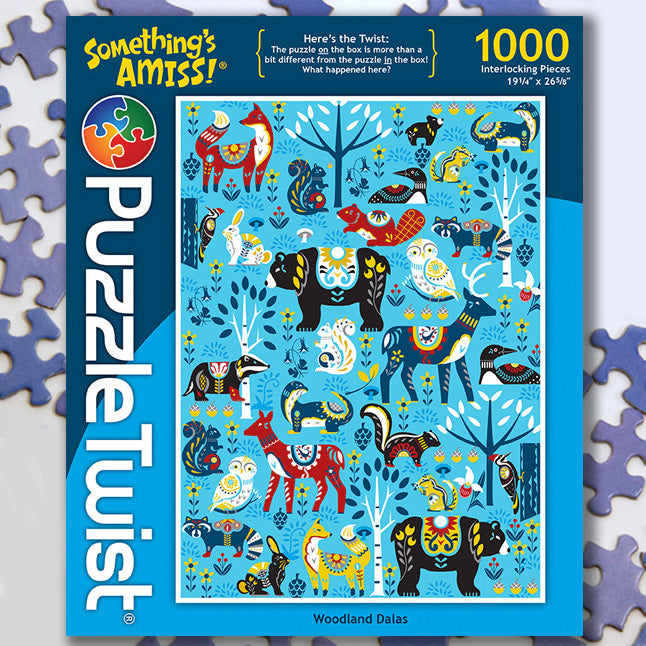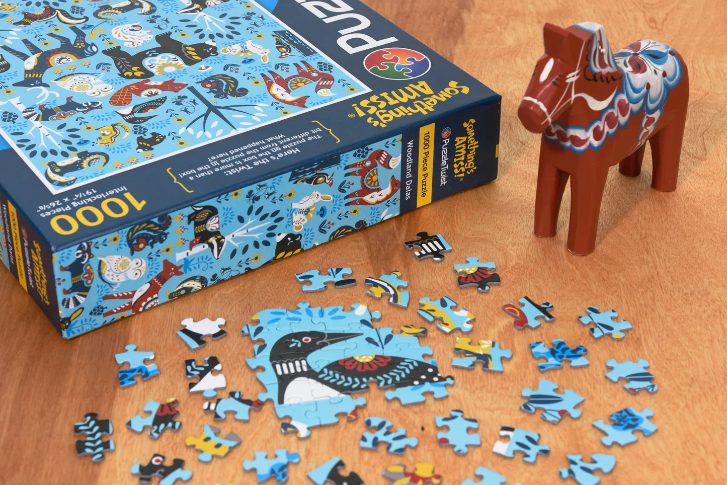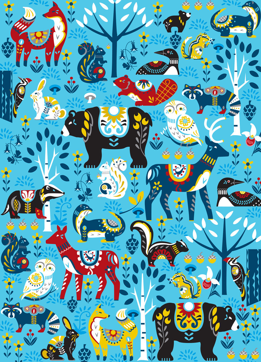 Cindy Lindgren drew inspiration fro this puzzle illustration from the Swedish dala horse. She wanted to put her own twist of decorative art on animals found here in the woods including bear, deer and foxes. You can find Cindy's like of illustrated products in gift shops throughout the upper Midwest.